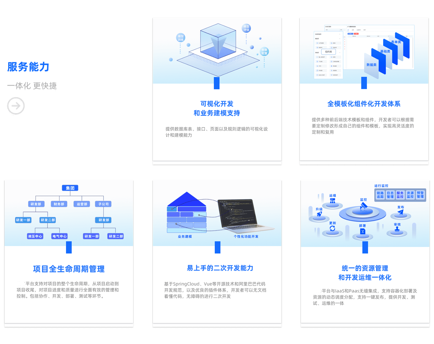 面向应用开发者,提供应用功能规划、设计、开发、测试、运维全面支撑的工具化平台和效能管理平台,利用低代码技术快速构建个性化应用,为企业数字化转型快速赋能。沉淀开发工具和标准模型组件,减少重复低价值开发工作;结合业务平台的底层框架封装,屏蔽技术复杂度;完整的开发运维一体化系统,确保开发规范落地和高效交付;国产化适配,摆脱工业软件卡脖子问题。