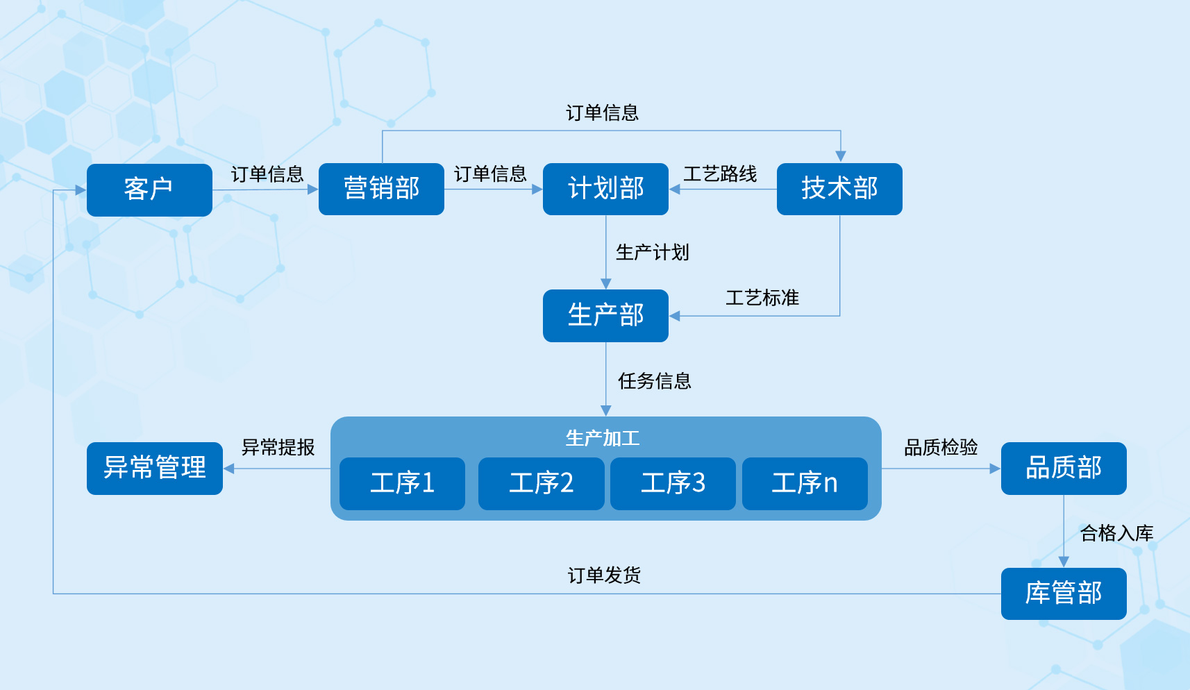根据企业的运营管理规范,支持对工厂的产品、工序、路线、异常类型、品质不良类型等数据进行灵活配置,为系统敏捷使用建立基础信息模型,实现生产数据的规范化、标准化、系统化的管理与共享。
